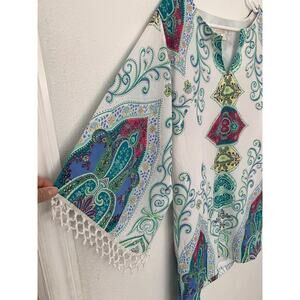 Boston Proper Multicolor Moroccan Print Fringe Kimono Tunic Dress XS the longer fringe on the sleeves has been removed see photos.