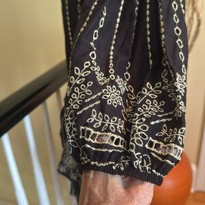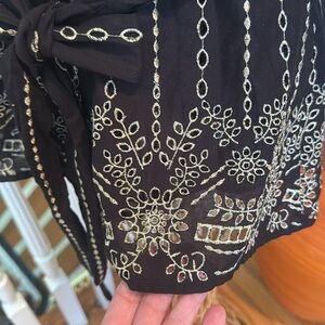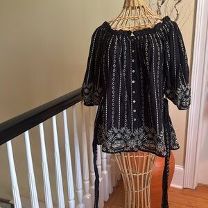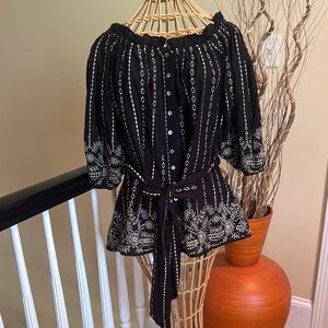New. Very nice top. Can be used with the belt or without the belt. Love the sleeves Comes with extra buttons