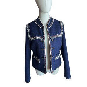Step out in standout sophistication with this preowned Boston Proper navy blue tweed jacket in size 6. Featuring eye-catching red, white, and blue braided trim, this jacket is a nod to timeless Americana with a chic, structured silhouette.
