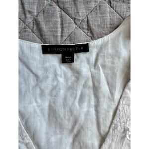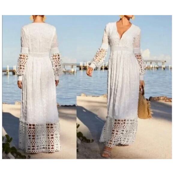 New With Tag! Boston Proper V-Neck Long Sleeve White Maxi Dress with Lace Tiers and white flower applicates and gathered waist. Size large 22" pit to pit and 58" shoulder to hem. Cuffed sleeves. 100% cotton with polyester lace detailing. Smoke free pet free home. MSRP $240