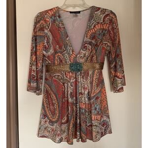 Boston Proper Orange Turquoise Paisley Top Beaded Rhinestone Bling Blouse S