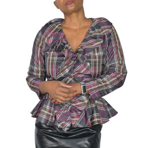 Boston Proper Peplum Ruffle Blouse Purple Plaid Tartan Shirt Check Top Small
