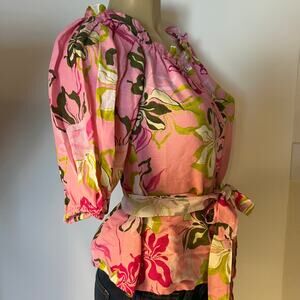 Boston Proper, Pink Linen Puff Sleeve Tie Waist Peplum Blouse Size XS