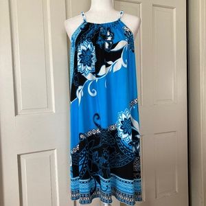 Made by Muse exclusively for Boston Proper. Blue, black, and white floral halter dress with striped border hem. The straps are white plastic chain with blue fabric woven thru the straps!!! Incredible and very unique !!! Fabric is vey comfortable and cool, made of 95% Polyester and 5% Spandex. Measurements are approx. and on a flat surface. Armpit to Armpit = 19". Length from center top of neckline to hem =32" . Width across hemline, L to Rt = 29". Worn one time for occasion. Like new and in excellent condition! Wish I could find another in a larger size.