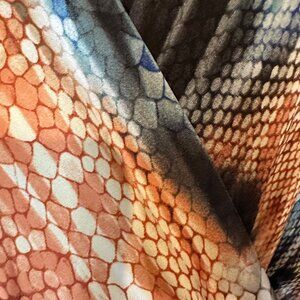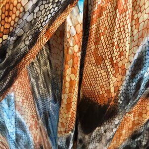 A sleek halter-style maxi dress featuring a python-inspired print in shades of orange, blue, and gray, designed with a wrap silhouette and coordinating belt.