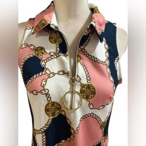 Stylish sleeveless tunic with a striking chain pattern. Features pink, navy, and gold hues. Ideal for casual outings.