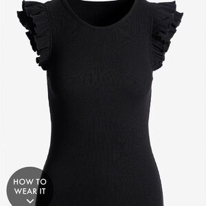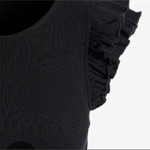 A statement ruffle shoulder frames the crew neckline of this soft ribbed knit fabric tank.