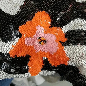 • All Over Black and White Zebra Stripes with Coral/Pink Blossoms in Front