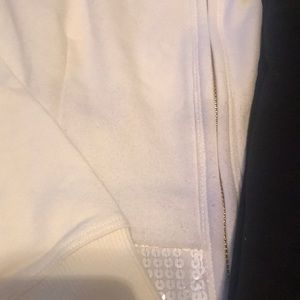 It’s been storage and has some stains from the pants in to the sweater, the pants is black with off white lines on the side.
