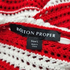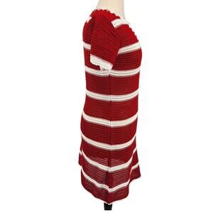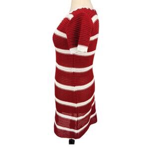 This sheer crochet dress from Boston Proper features alternating red and white horizontal crochet stripes, a short-sleeve silhouette, and a V-neckline trimmed in white. No underslip included. Add your own or wear as a beach cover / layer