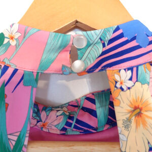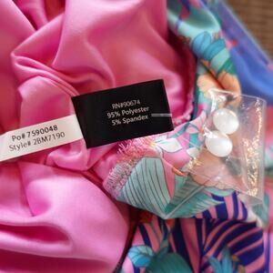 Color/Print: Pink multi with tropical floral and leaf pattern (teal, aqua, purple, orange)