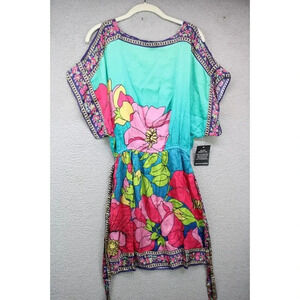This is a Boston Proper Silky Floral Short Dress that has cold shoulders and a tie waist. It is New with Tag and is a size Small. It is very vibrant and beachy. It is 55% Viscose and 45% Rayon. It is very soft. It has Dolman type sleeves and is 36.5" in Length. In New Condition.