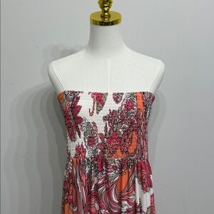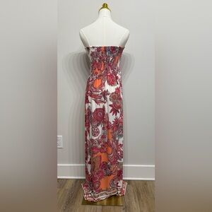 Strapless maxi dress with vibrant pink and orange floral patterns. Perfect for summer occasions.