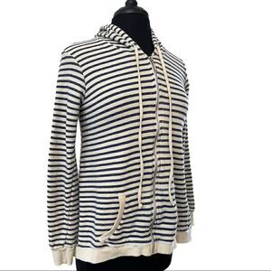 Boston Proper Sport full zip front hoodie. Navy and cream “distressed” stripes. Shark bite raw edge hem. Contrasting cream cuff and hem. Gently used condition.