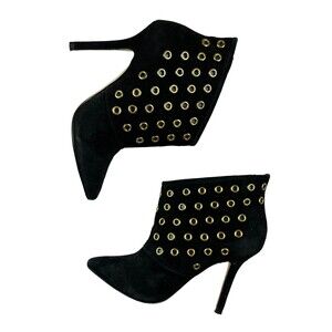 Boston Proper Stiletto Black Suede Ankle Boots w Gold Grommets
