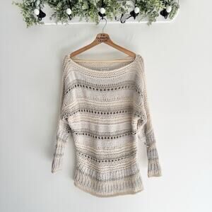 Boston Proper Striped Open Crochet Knit Boat Neck Sweater Brown/tan Gray Small