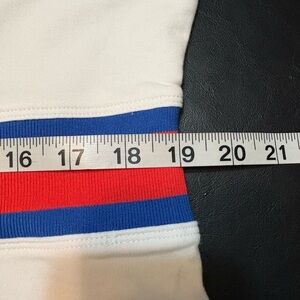Stylish white dress with bold blue and red accents. Sleeveless design.