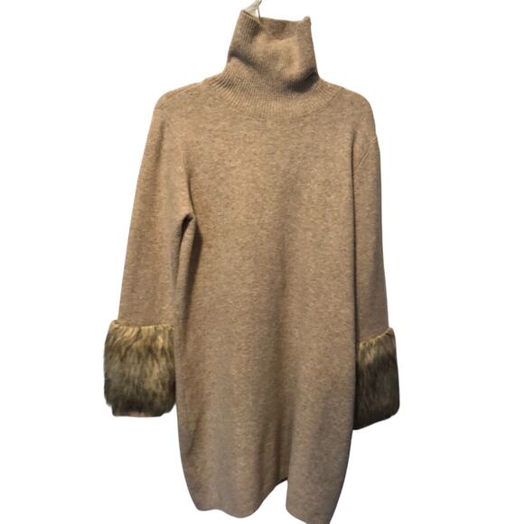 Boston Proper Tan Knit Pullover Turtleneck Dress with faux fur sleeve ends Sz L