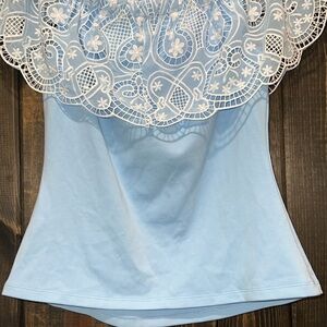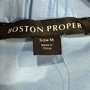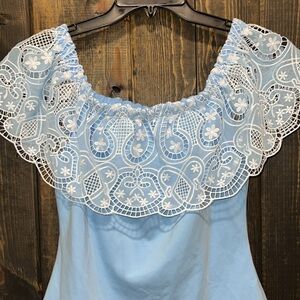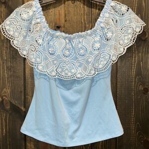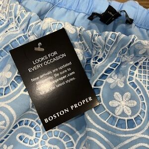 New with tags. Boston Proper brand two-tone lace overlay top. Size medium. Off the shoulder style. Elastic. Stretch material. Blue & white. Cami lined. Scalloped lacey overlay. Boho chic style. Dress up or down.