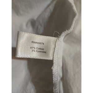 This Boston Proper white crisp cold shoulder flare sleeve cotton blouse in size 12 is a classic and stylish addition to any woman's wardrobe. The collared neckline, button closure, and slim fit make it perfect for travel and casual occasions. Made from lightweight woven cotton, this blouse is easy to care for with machine washable instructions. The flattering cold shoulder sleeve design and solid white color add a touch of elegance to this versatile top, making it a must-have for the summer and spring seasons.