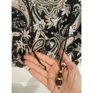 beaded blouse, paisley top, women's long sleeve, Boston Proper blouse, embellished neckline, dressy top, spandex blend, black and tan, size small blouse, decorative blouse, elegant women's top, lightweight women's top, bohemian style blouse