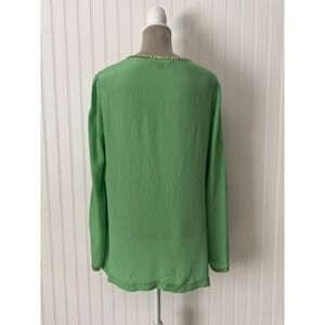 The Boston Proper Women's Lightweight Beaded Tunic Top Blouse in green with pink accents is a stylish and comfortable addition to any woman's wardrobe. This blouse features a V-neckline, long casual sleeves, and a viscose material for a lightweight feel. The beaded accents add a touch of artsy flair, making it perfect for resort wear or casual outings. The tunic style and size medium make it a versatile piece that can be dressed up or down for any occasion.