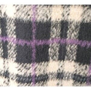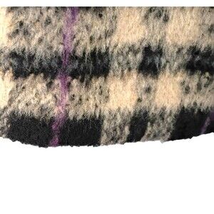 Back zipper with inner tab & button enclosure. Small darts front and back at waist for slight contour. Large abstract black and white check pattern, with purple/berry/lavender stripes. Fully lined with black taffeta.