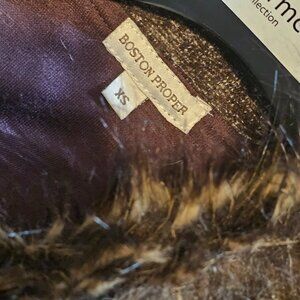 Boston Proper XS Brown Tweed Boucle Knit Faux Fur Ruffle Trimmed Sweater Jacket