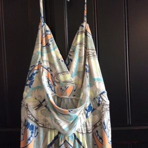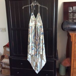 Perfect dress for your next vacation. Maxi, handkerchief bottom, halter straps, pretty pattern and colors for the beach. Size 0