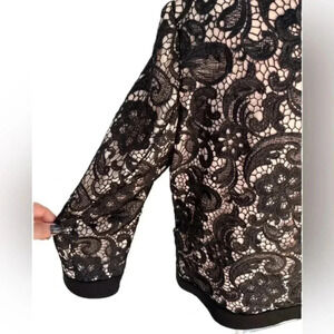 Super fancy black lace jacket with two fasteners. Would be great over a black dress.