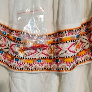 once again I am cleaning out my closets and I am getting rid of a brand new Boston Proper off-the-shoulder ivory top with real shells on it. there is a tag still attached with an extra shell and some beads. There is a shell missing from the front of the top. This can be easily fixed. There are no rips, stains or tears.