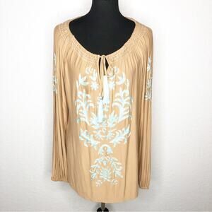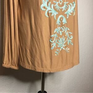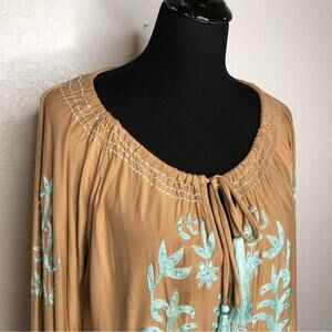 Boston Proper tan brown aqua blue embroidered sequin tunic top. Pullover style with round neckline. Keyhole opening with tassel tie at front neckline. Elastic sleeve cuffs. Size Small. Very good preowned condition. Minor wash wear. A couple of tiny spots.