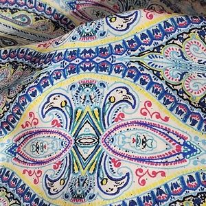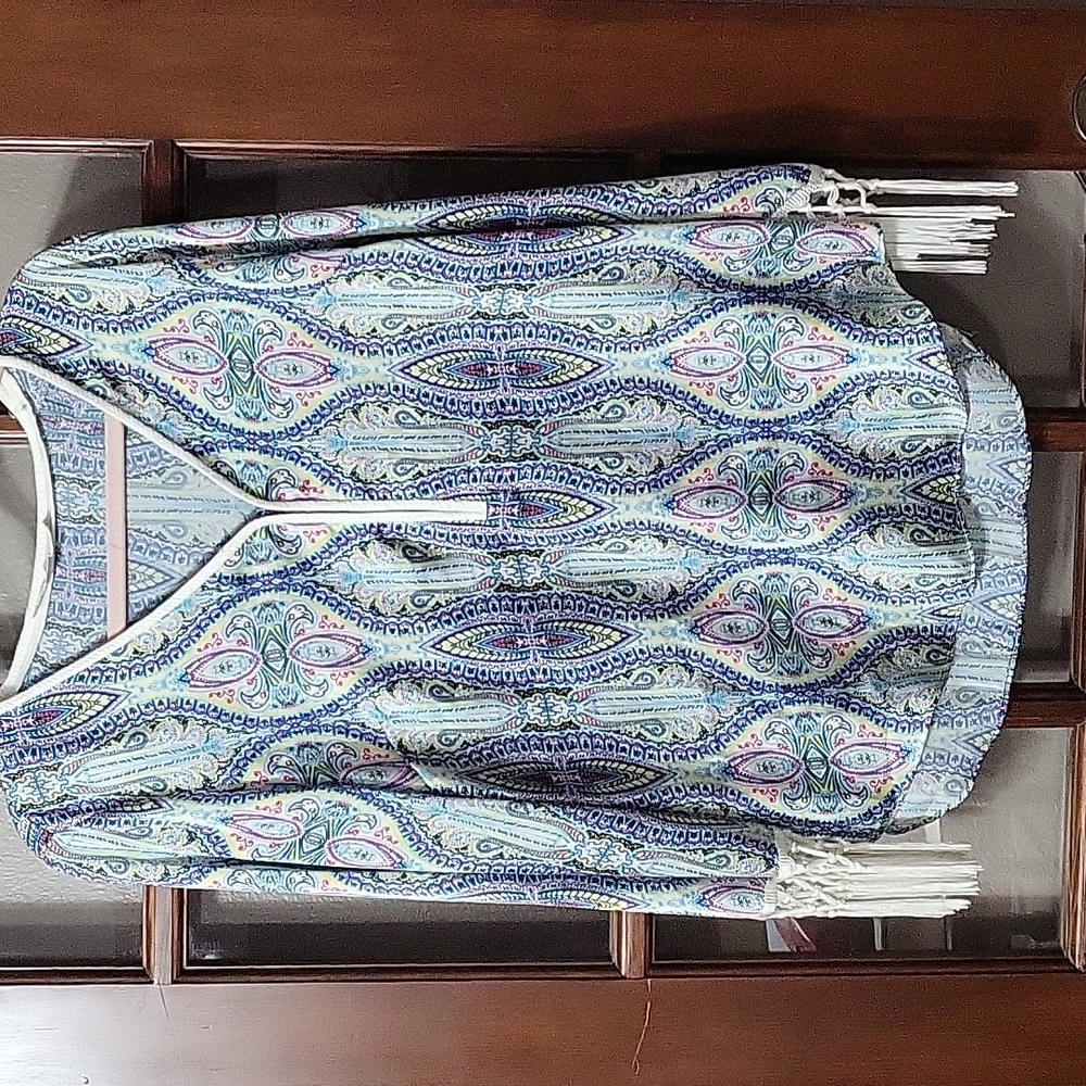 p2p 21, length 28 inches. Sleeves have fringe at wrist. Boho feel satin silky feeling.