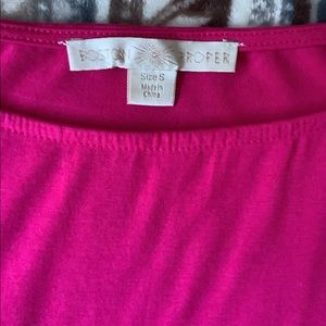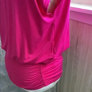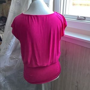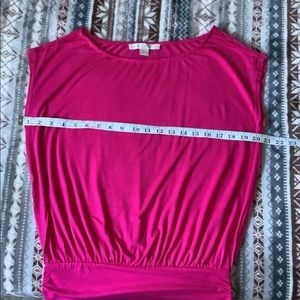 Banded bottom tunic top in unworn condition. Beautiful deep raspberry color. Rushed sides. Looks so nice on skinny jeans/ pants. Size S on tag but fits well on 8-10 size lady, more like medium. See measurements.