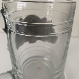 Boston Red Sox Clear Glass Beer Mug. Adhered to the front is a silver tone metal plate with Boston Red Sox logo and Boston skyline behind it. Holds up to 15 ounces of liquid, which is just about to the top of the mug. Some surface scratches on the glass from use and storage. No chips or cracks. The mug is about 5 1/2" tall.