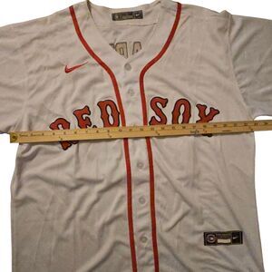 The product is a Men's Large Boston Red Sox J.D. Martinez #28 Nike Jersey, officially licensed for Major League Baseball. The jersey is in white with the player's name and number printed on the back, making it a perfect choice for fans of both the player and the team. Made by Nike, this jersey is designed for the regular baseball season and is perfect for showing support for the Boston Red Sox during games or casual outings.