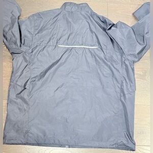 Lightweight blue windbreaker with front zipper. Features subtle logo detail. Ideal for casual wear.