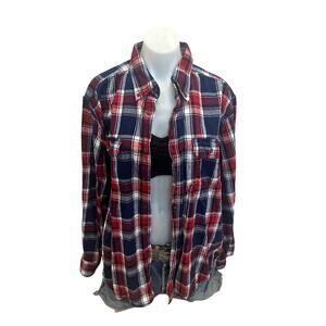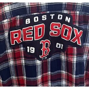 Relaxed boyfriend style comfy soft plaid flannel Red White Blue plaid with Button Up Red Sox applique on the back, upcycled from a flannel.