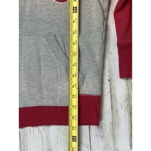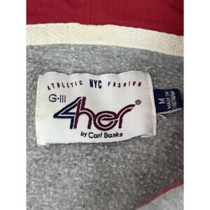 Boston Red Sox women’s full-zip hoodie by G-III 4Her, size medium. Features red sleeves, gray body, and embroidered “Red Sox” and MLB graphics. Soft cotton-blend fleece with drawstring hood and split kangaroo pockets. Moderate wear with some light fraying on appliqué edges (see photos)—typical for this style and adds to the vintage-sport aesthetic. See photos for details and measurements. Most items ship next business day.
