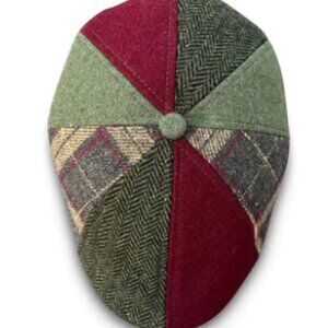 The 'Kringle' 8-panel patchwork scally cap with its crimson, green and Christmas plaid and herringbone panels contrasted with the green brim underneath ties it all together. Underneath is our Collector's Edition logo of The 'Kringle' himself.