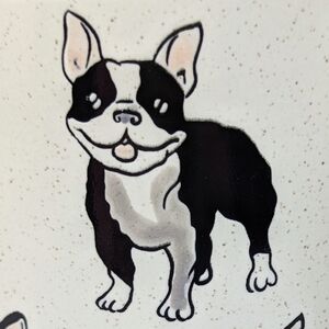Café con Boston Terriers! Ceramic mug with Boston Terriers embossed on outside. Inside of rim printed "Love my Boston Terrier" one side. Microwave and dishwasher safe.
