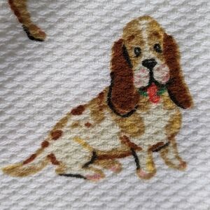 Textured cotton. Boston Terrier and multibreed pups printed in multi-colors on white background, one side. Both towels in set have identical print.