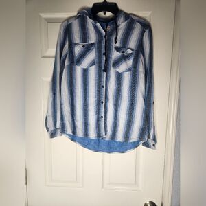 Boston Traders M Striped WhiteBlue Women's Lng Slve ButtonDown Flannel with Hood