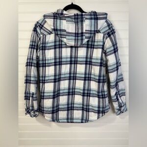 Boston Traders white and purple plaid sherpa lined button up shacket. Size small. Hooded, EUC.