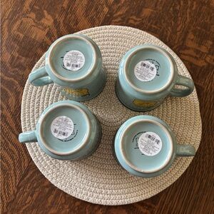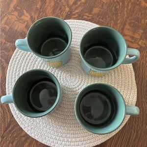 Set of four blue mugs with yellow pear design. Perfect for dining and entertaining.
