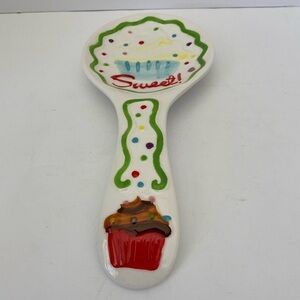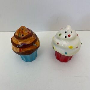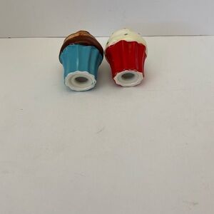 Boston Warehouse Salt & Pepper set with Spoon rest three piece set Cupcake theme. A small chip on the red cupcake. New Open Box