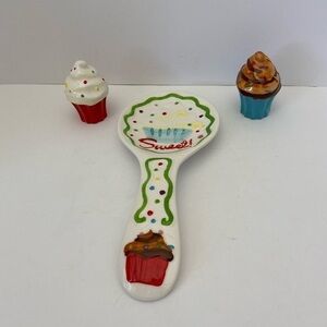 Boston Warehouse Salt & Pepper set with Spoon rest three piece set Cupcake theme
