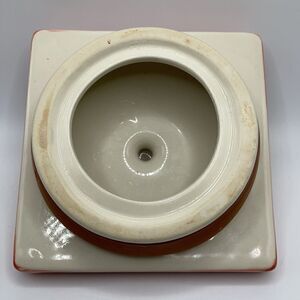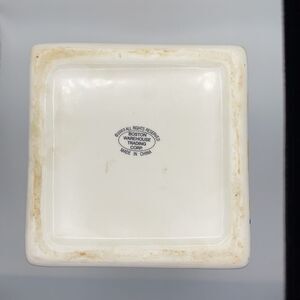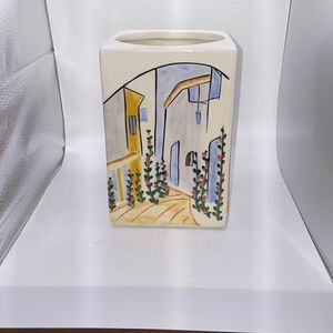 Vintage ceramic bistro kitchen canister with different painting on each side, and a webbed looking removable lid. There is some wear on the bottom, the inside lid, and a little on the inside, but this is in excellent overall used condition. Approximate measurements shown in photos.
