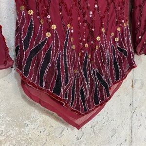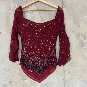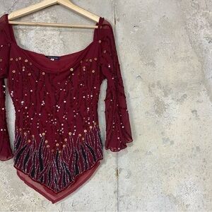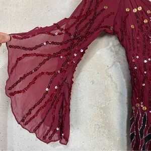Boston proper y/2k 2000s maroon burgundy shiney sequin rhinestone blouse with flames to the pointed hem. Flare split sleeves. Rounded draped neckline. Two places with missing sequins pictured.