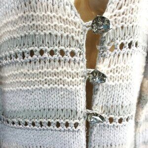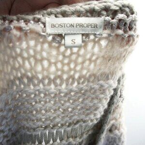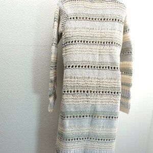 this is a boston proper long cardigan. size S. striped. done in soft shades. very good preowned. big jewel 3 button closure.acrylic,wool, rayon,lurex blend.measurements are pit to pit 21". top to bottom 45".